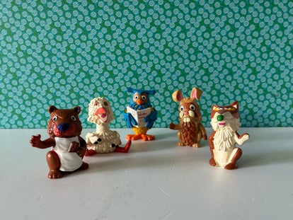Vintage Wile E. Coyote actiefiguur van Bulland Warner Bros uit 1990. Hij heeft een mes en vork in zijn handen.8,5cm hoog