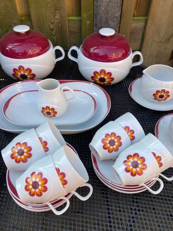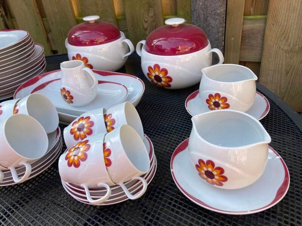- de 2 hogen schalen missen allebei een piepklein flintertje van de rand. Sommige borden hebben wat krasjes door gebruik. Verder helemaal gaaf.