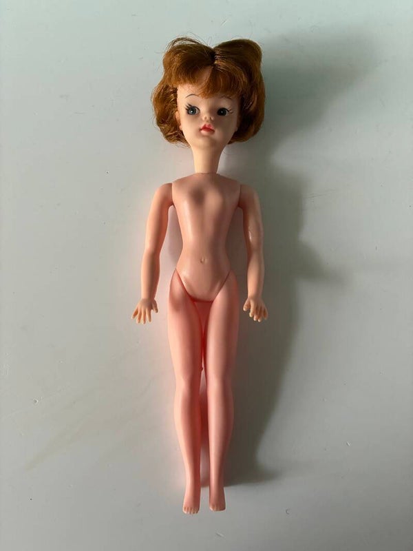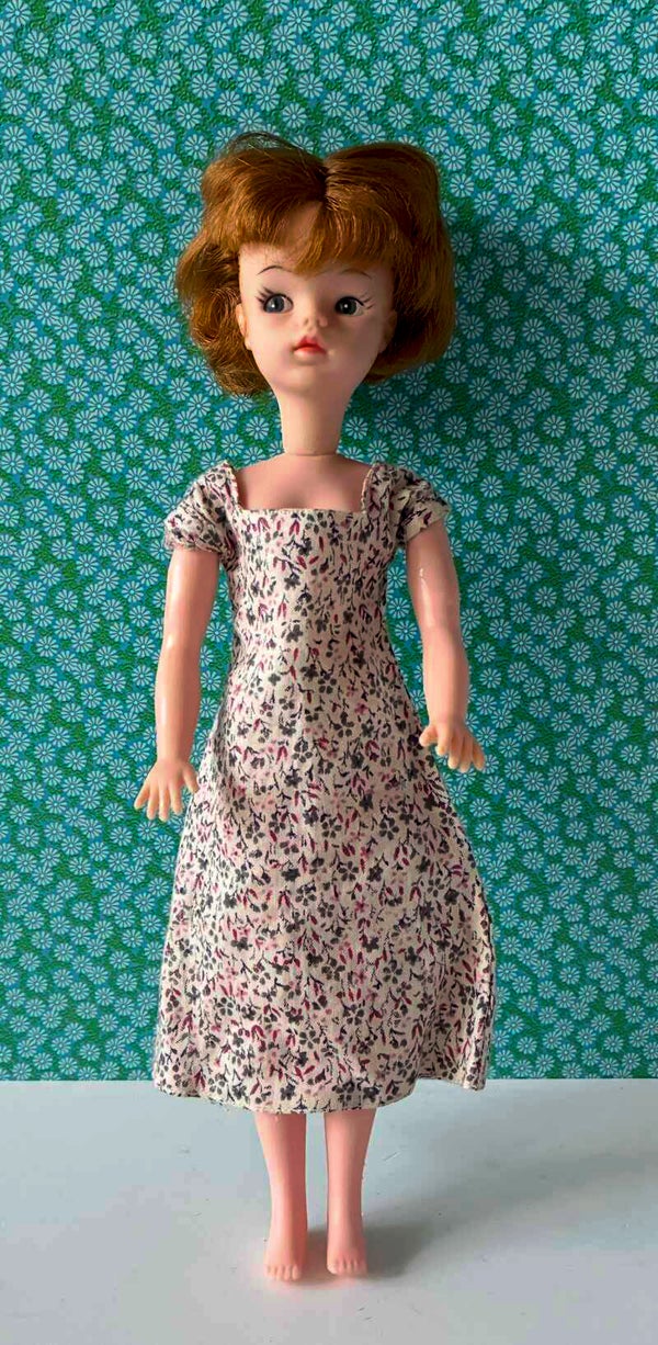 Vintage 60’s Camay Sindy (barbie) pop in koffer.Ze heeft een plastic lijfje en benen, en rubberen armen en hoofd.Komt met verschillende kleertjes en koffer.