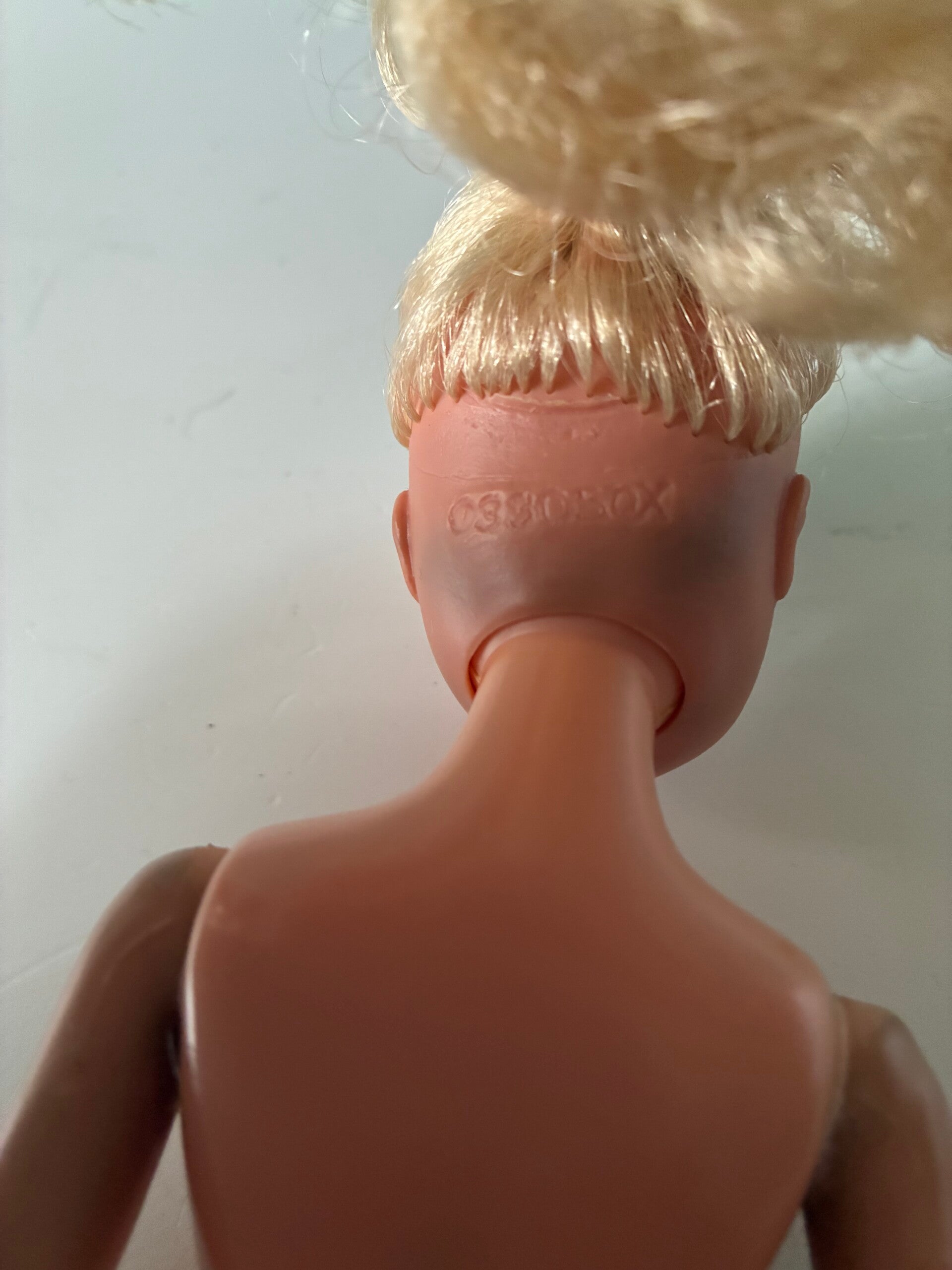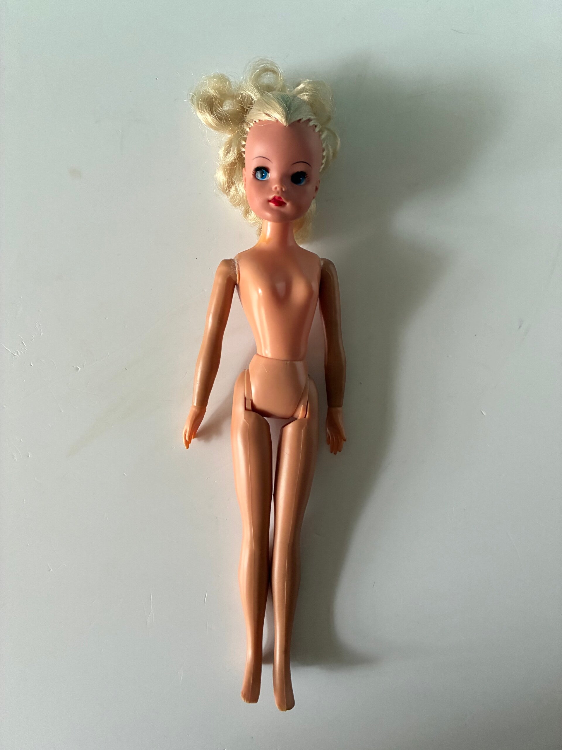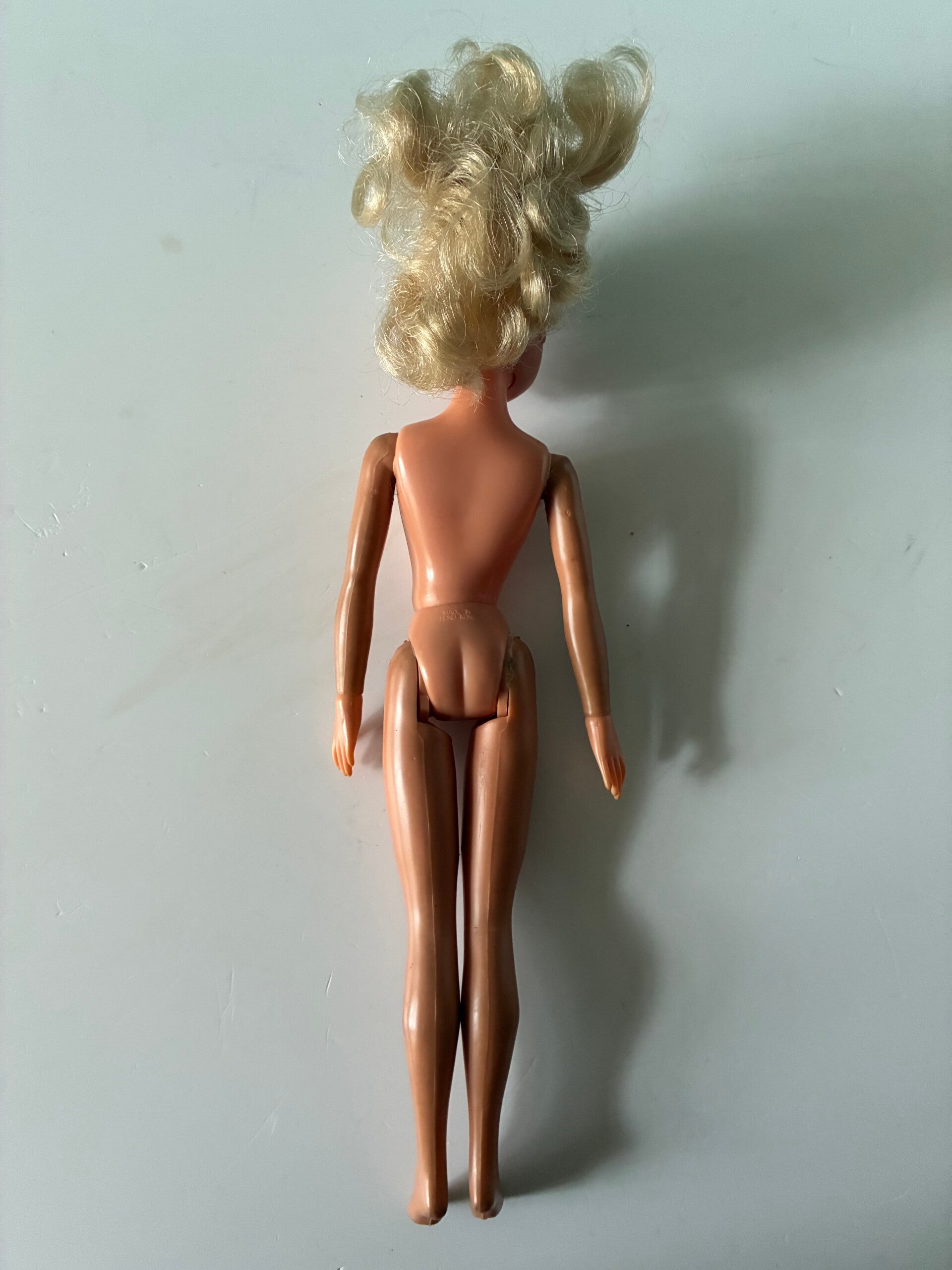 Met extra setje kleding. Plastic lijfje met buigbare armen en benen. In haar nek heeft ze wat kleuring. Made in Hong kong